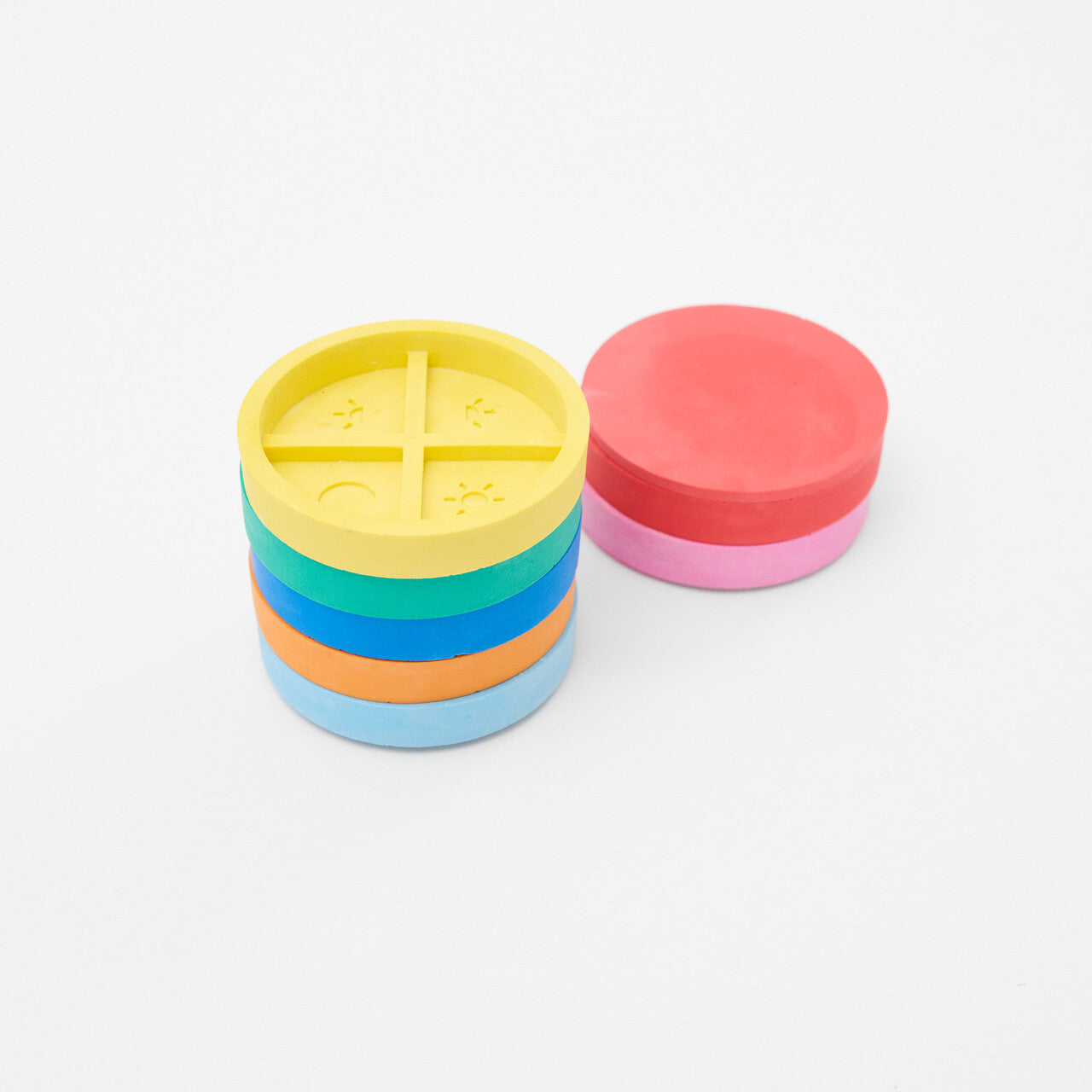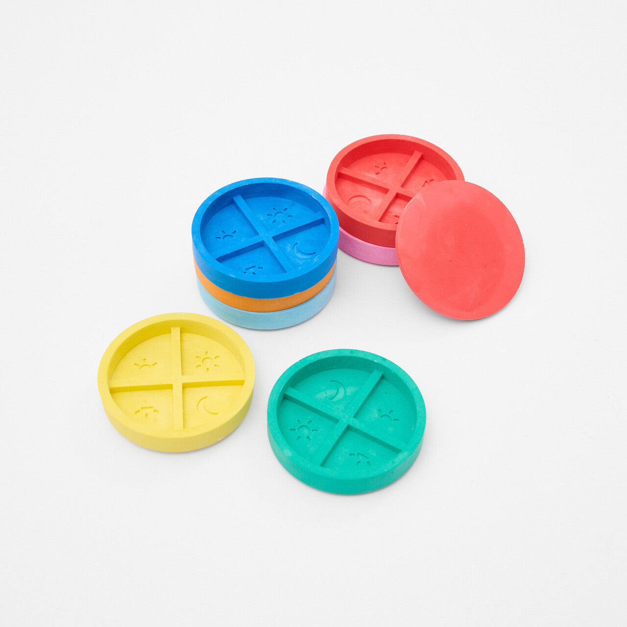 Jeder Turm enthält 7 farbige Schalen, eine für jeden Wochentag. Jede Schale ist in vier Abteilungen unterteilt: Morgen, Mittag, Abend, Nacht. So wird das Sortieren von Medikamenten, Vitaminen oder kleinen Ritualen angenehm und übersichtlich.