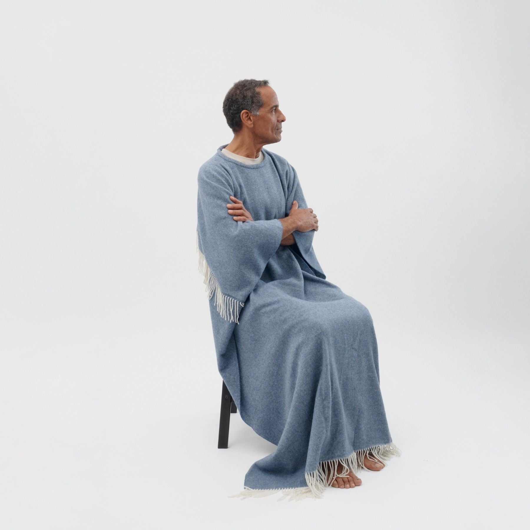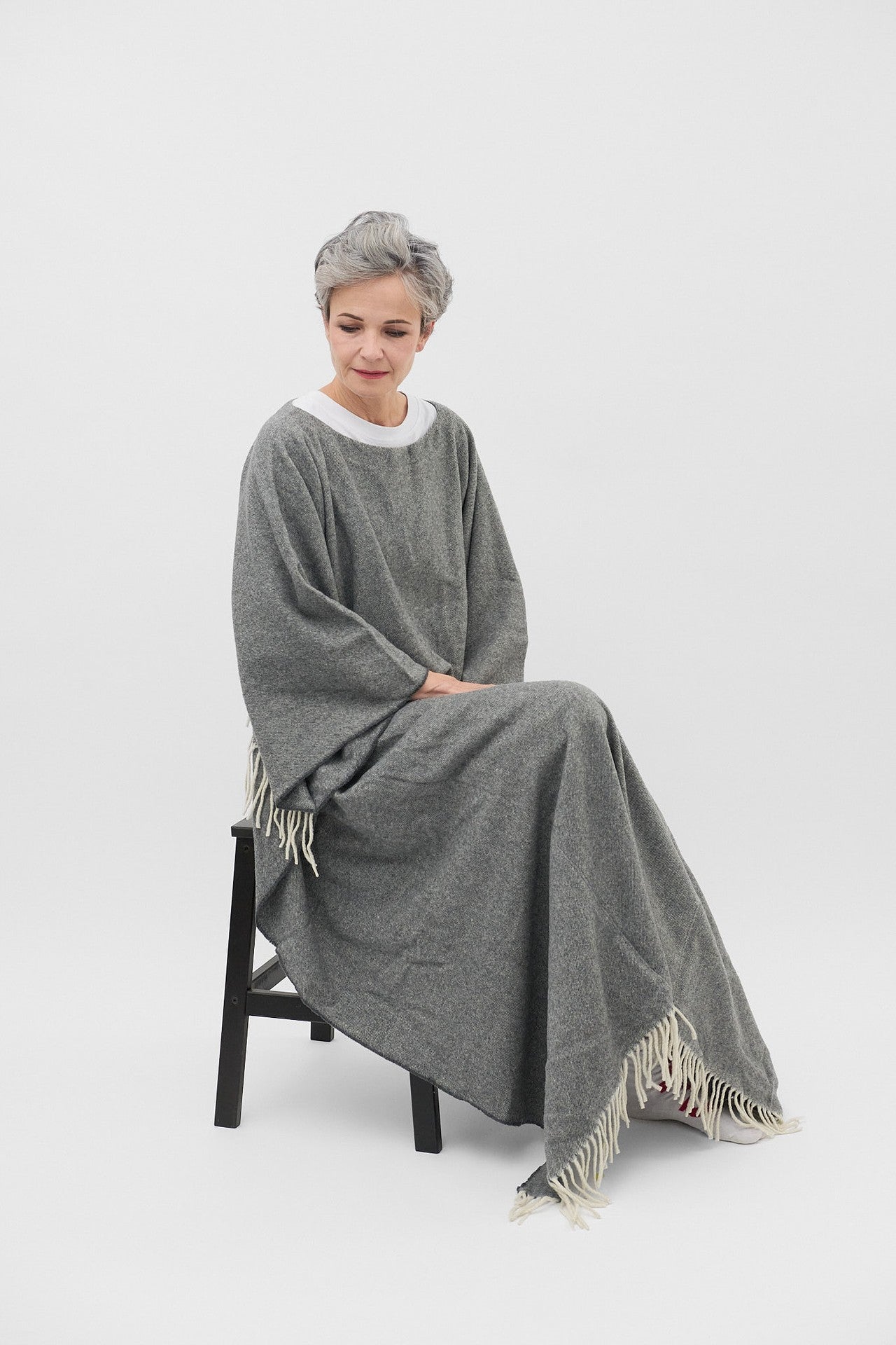 Dein Deckencape ist wärmender Überwurf und Sofakissen zugleich. Du kannst es wenden, je nachdem, wie Du es gerade brauchst. Du ziehst es über den Kopf, Deine Arme bleiben warm. Wenn Du aufstehst, knöpfst Du die Länge hoch.
