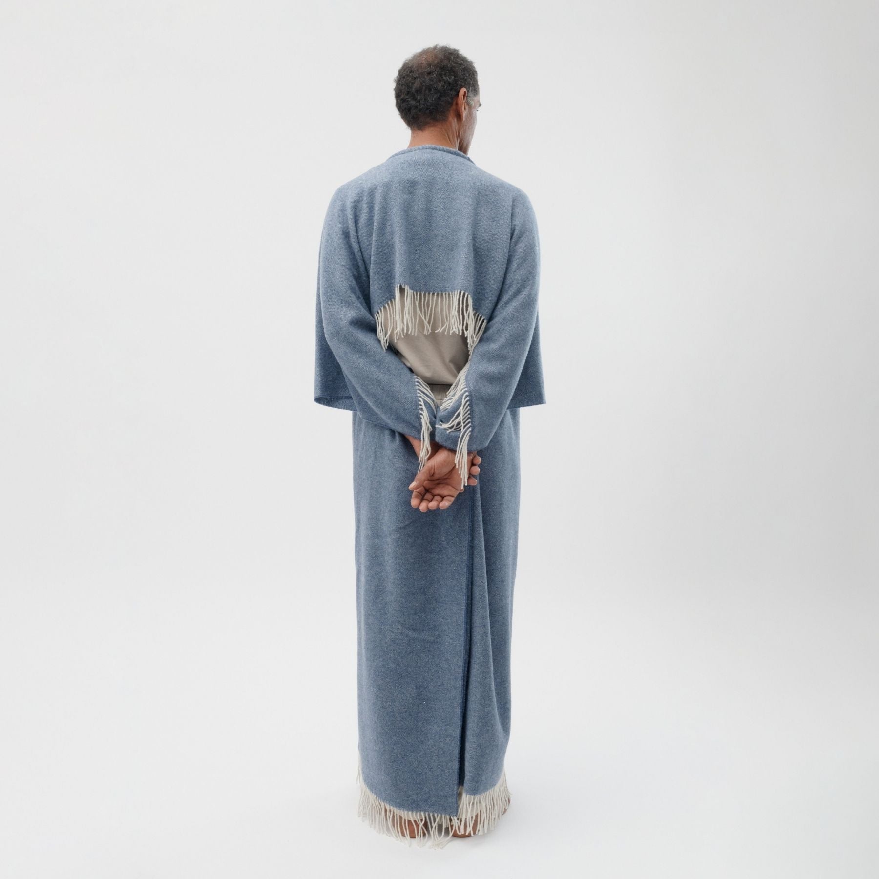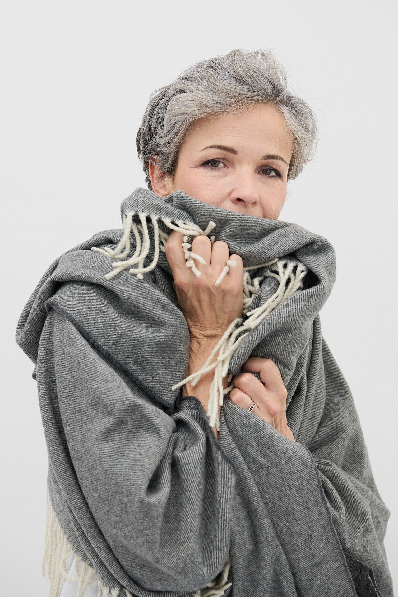 Du kannst Dich frei bewegen, der Schnitt hält das Cape an Dir. Wenn Du sitzt, kannst Du die Decke über Dich ausbreiten, Deine Füsse finden Platz in der Tasche unten am Saum. Ist es Dir wieder wohler und wärmer, rollst Du die Decke in die Tasche ein, die zum Kissen wird.